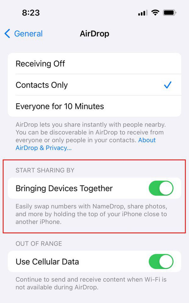 NameDrop là tính năng này cho phép hai chiếc iPhone có thể trao đổi nhanh thông tin liên lạc gồm số điện thoại và hình ảnh bằng cách đặt chúng gần nhau. Để tắt trên iPhone, phụ huynh vào phần Cài đặt (Settings) > Cài đặt chung (General) > AirDrop > Đưa các thiết bị lại gần nhau (Bringing Devices Together) > kéo nút gạt để tắt Namedrop.