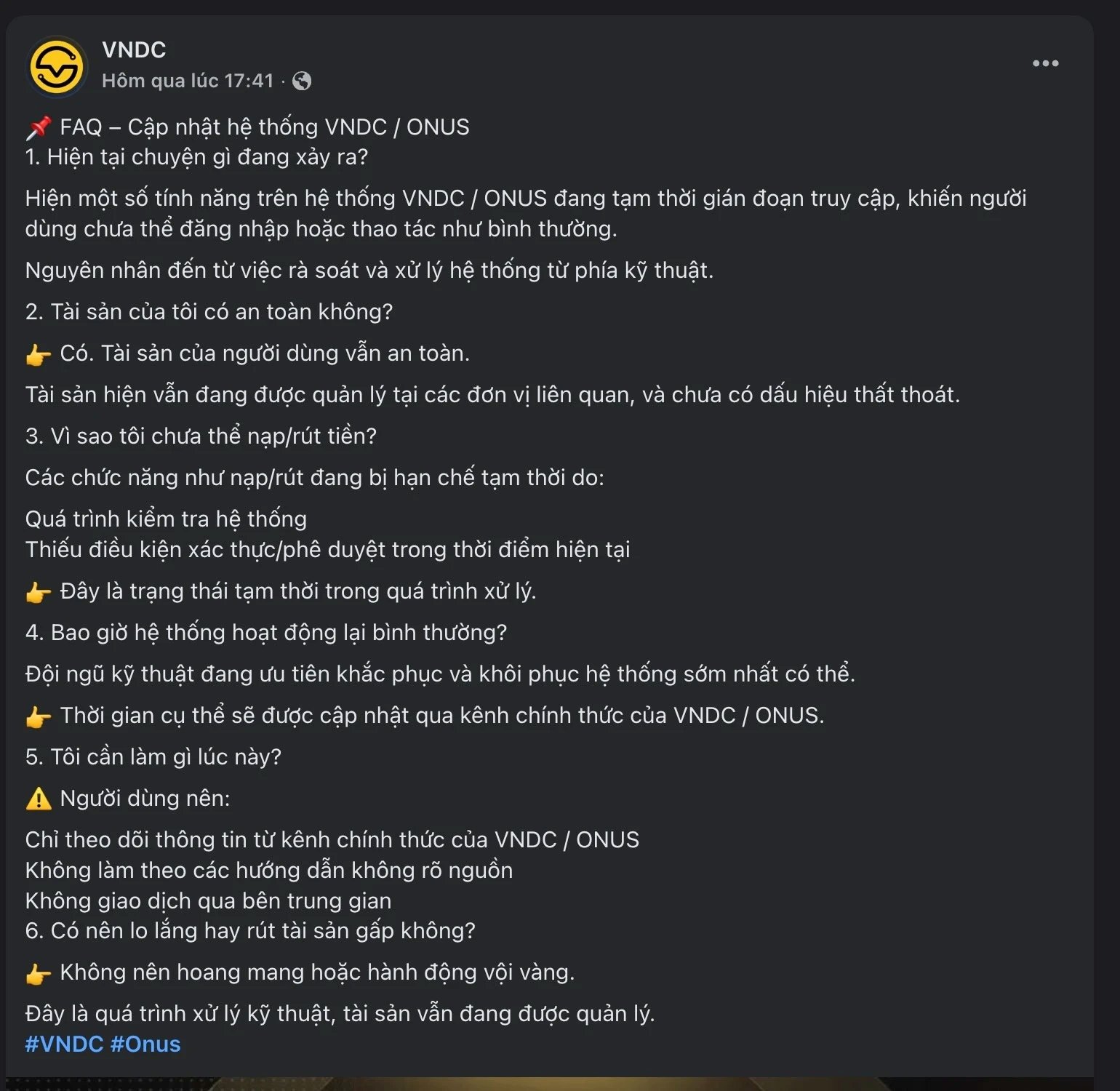 Theo công bố mới nhất, hệ sinh thái liên quan đến stablecoin VNDC cho biết tài sản của khách hàng vẫn được đảm bảo, chưa ghi nhận dấu hiệu thất thoát. Tuy nhiên, do hệ thống đang trong quá trình rà soát kỹ thuật, người dùng hiện chưa thể thực hiện các giao dịch nạp, rút tiền.