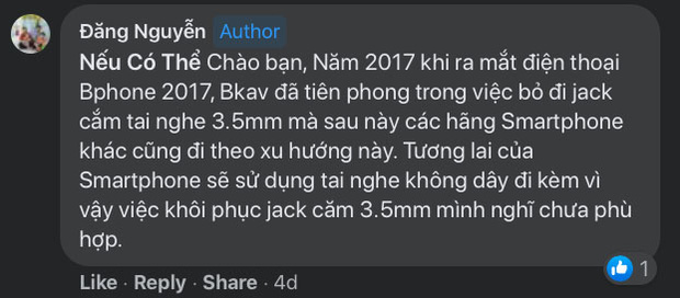 "Năm 2017 khi ra mắt điện thoại Bphone 2017, BKAV đã tiên phong trong việc bỏ đi jack cắm tai nghe 3.5mm mà sau này các hãng smartphone khác cũng đi theo xu hướng này. Tương lai của smartphone sẽ sử dụng tai nghe không dây đi kèm vì vậy việc khôi phục jack cắm 3.5mm mình nghĩ chưa phù hợp", ông Đăng viết trên mạng xã hội.