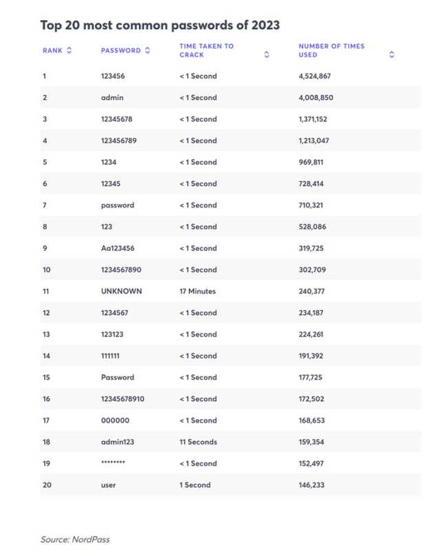 Theo CNBC, bất chấp tình trạng các mối đe dọa an ninh mạng ngày càng gia tăng, nhiều người vẫn có thói quen sử dụng mật khẩu đơn giản. Thông qua trích dẫn từ báo cáo của NordPass đã chỉ ra 20 mật khẩu phổ biến nhất và trong số này có đến 17 mật khẩu dễ dàng bị hacker bẻ khóa trong chưa đầy 1 giây.