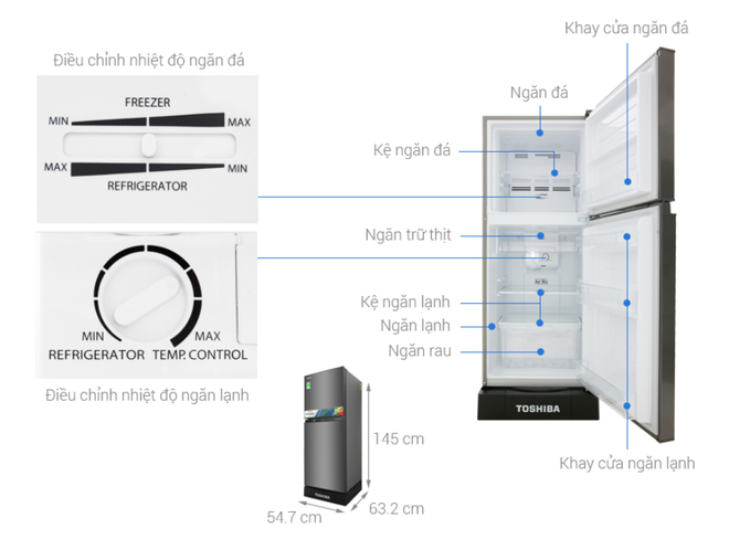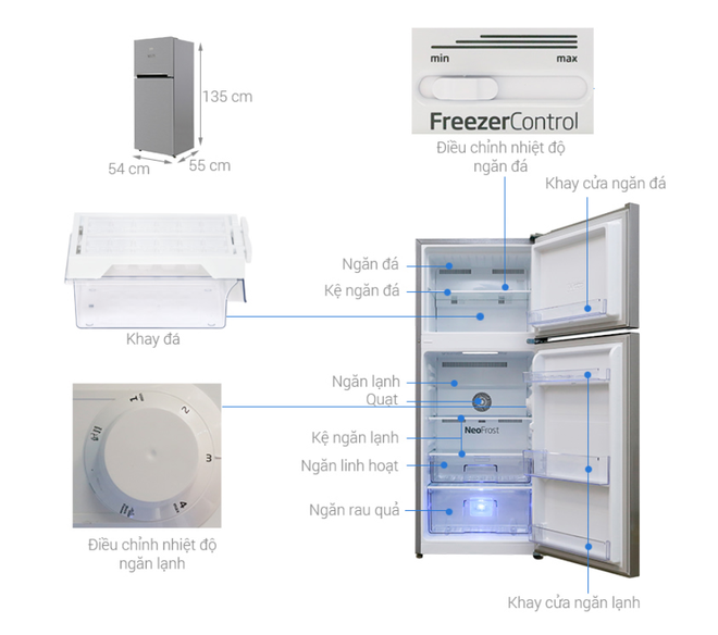 Tiện ích: Inverter tiết kiệm điện, dàn lạnh hoạt động độc lập, chuông báo cửa mở, ngăn kệ có thể thay đổi linh hoạt với chiều cao 135 cm, rộng 54 cm, sâu 55 cm và nặng 35 kg.