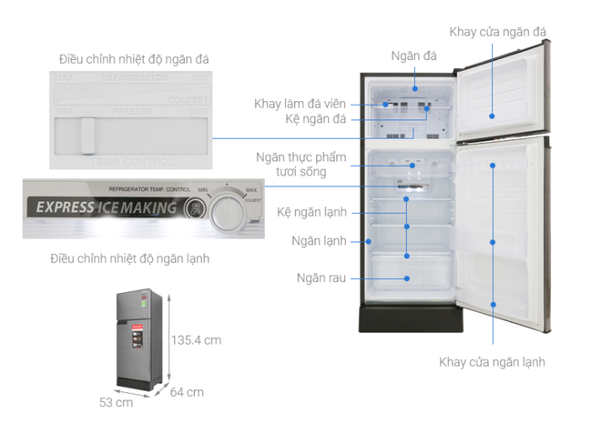 Tủ lạnh Sharp có chiều cao 135.4 cm, rộng 53 cm, sâu 64 cm và nặng 34 kg.