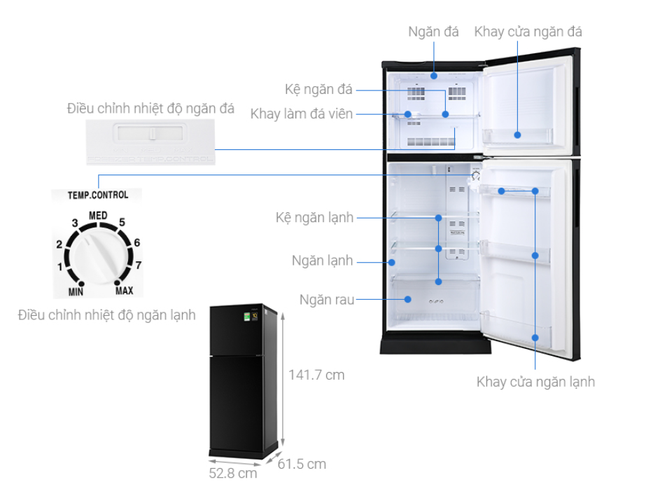Với dung tích 165 lít, tủ lạnh 2 cửa này là sự lựa chọn lý tưởng cho gia đình 2 - 3 người với công suất tiêu thụ công bố theo TCVN:~ 0.81 kW/ngày