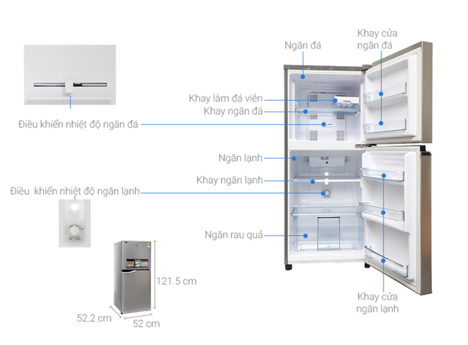 Công suất tiêu thụ công bố theo TCVN:~ 1.15 kW/ngày với chiều cao 121.5 cm, rộng 52 cm, sâu 52,2 cm và nặng 30 kg. Chất liệu cửa tủ được làm từ thép không gỉ. Mẫu tủ lạnh này có giá 4,7 triệu đồng.