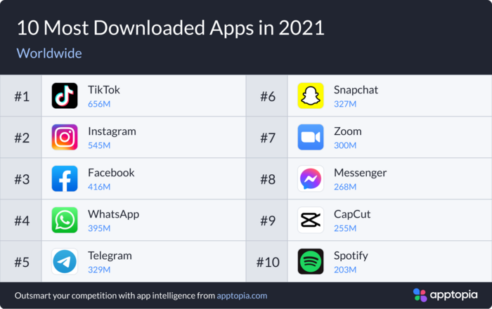 Năm nay, Apptopia vẫn duy trì “truyền thống” với bản công bố những ứng dụng được tải xuống nhiều nhất năm 2021 trên cả 2 hệ điều hành Android và iOS.