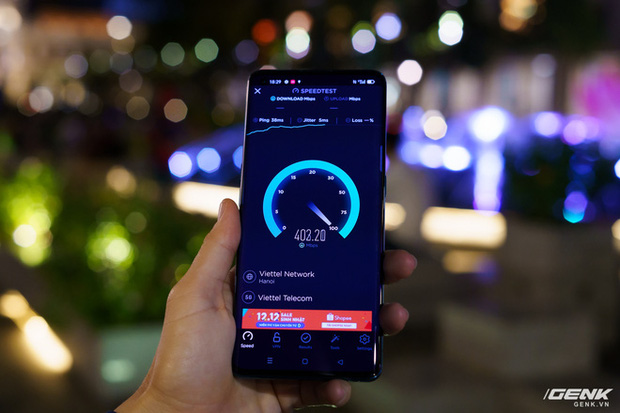 Thử nghiệm qua ứng dụng Speedtest, mạng 5G Viettel có tốc độ tải về dao động trong khoảng 300-500Mbps. Dù không đạt được đến mức 1Gbps như trong điều kiện lý tưởng, nhưng mức 300-400Mbps vẫn được đánh giá là rất tốt, đặc biệt khi so sánh với 4G. Tại cùng một vị trí và cùng sử dụng mạng Viettel, tốc độ 4G chỉ dao động trong khoảng 33Mbps.