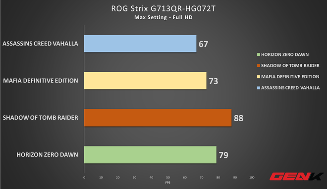 Tất nhiên, với các tựa game AAA bom tấn còn lại như Assasins Creed Vahalla, Shadow of Tomb Raider, GTA V, Mafia Definitive Edition hay Horizon Zero Dawn, mức FPS mà ASUS ROG Strix G17 đạt được ở tùy chọn Max setting đều ở mức cực cao (trên 60 FPS) trở lên, mang đến trải nghiệm chơi game cực kỳ mượt mà.