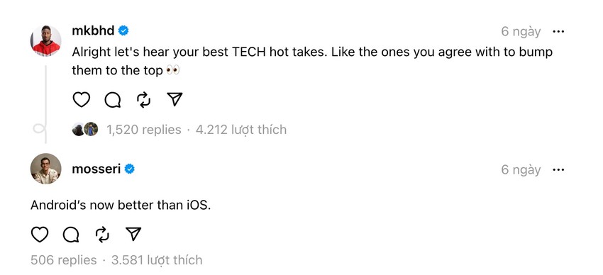 Trong lần chia sẻ mới nhất với Youtuber nổi tiếng Marques Brownlee, Adam Mosseri, người đứng đầu mạng xã hội Instagram cho hay Android bây giờ tốt hơn IOS? Bản chất của vấn đề này không mới, nhưng quan điểm của Mosseri bị xem là cảm tính nhiều hơn là dựa trên đánh giá công bằng.