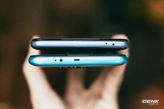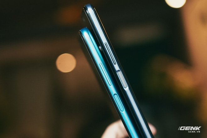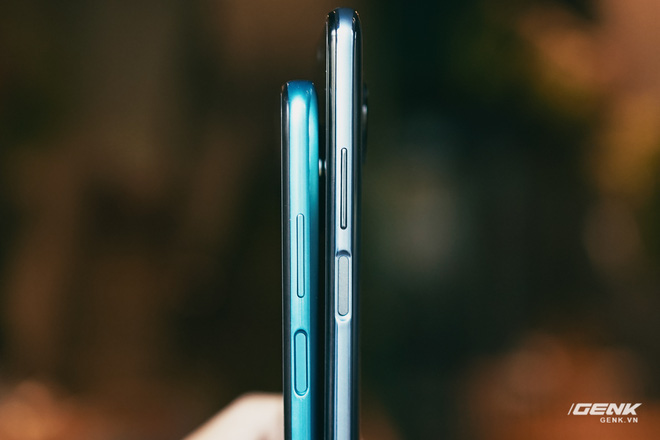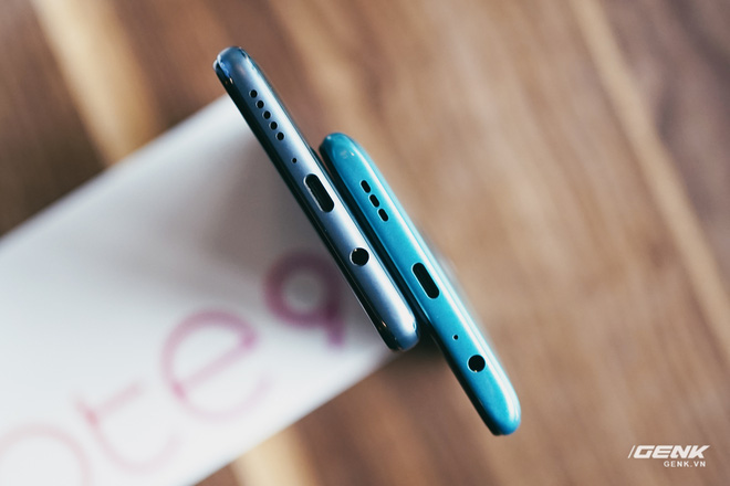 Ở mặt trước, Redmi Note 9 Pro (trái) được trang bị màn hình kích thước 6,67 inch, trong khi đó bản tiêu chuẩn (phải) thì có màn hình 6,53 inch nhỏ hơn một chút. Cả 2 màn hình này đều sử dụng tấm nền LCD IPS, độ phân giải Full HD+ cùng thiết kế "nốt ruồi"