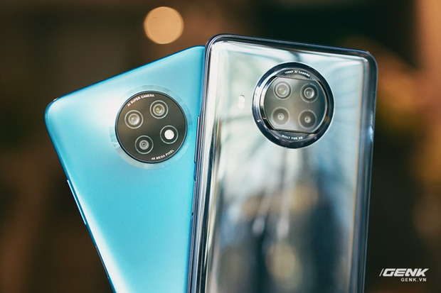 Redmi Note 9 Pro 5G (trái) và Redmi Note 9 5G (phải). 2 máy có thiết kế tương đối giống nhau với cụm camera được đặt trong mô-đun hình tròn ở mặt lưng. Khác biệt nằm ở chất liệu hoàn thiện: bản tiêu chuẩn hoàn thiện từ chất liệu nhựa nhám khó bám vân tay hơn, trong khi bản Pro lại là chất liệu kính bóng dễ để lại vết bẩn