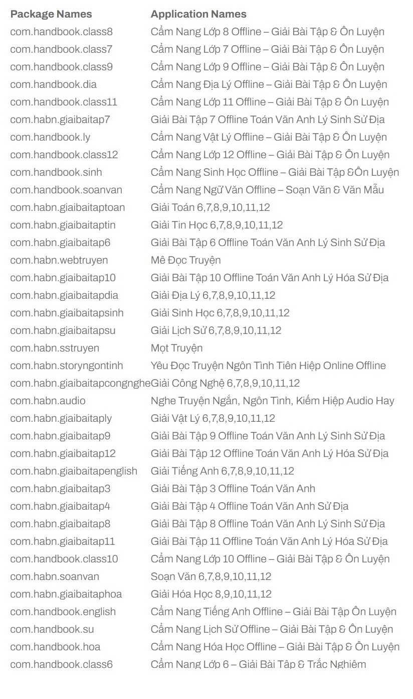 Ngoài Việt Nam, các nước như Mỹ, Canada, Australia, Brazil, Anh, Ấn Độ… cũng bị nhắm đến. Zimperium điểm tên một số ứng dụng chứa trojan như Cẩm Nang Lớp 8 Offline – Giải Bài Tập & Ôn Luyện, Cẩm Nang Lớp 7 Offline – Giải Bài Tập & Ôn Luyện, Giải Bài Tập 7 Offline Toán Văn Anh Lý Sinh Sử Địa, Mê Đọc Truyện…