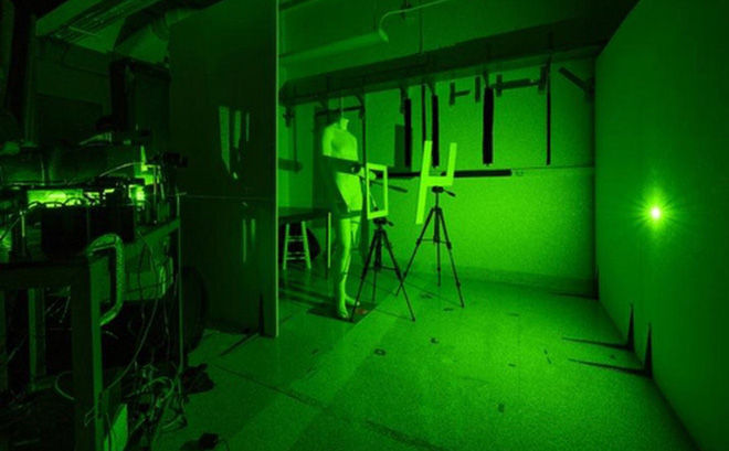 Họ chiếu một tia laser xung vào một bức tường bên trong căn hộ, sau đó chúng sẽ phân tán theo nhiều hướng. Một số hạt ánh sáng, hoặc photon, bị phản xạ tới hình nộm ẩn và một số khác đi tới một cảm biến đặt bên cạnh bộ phát laser.