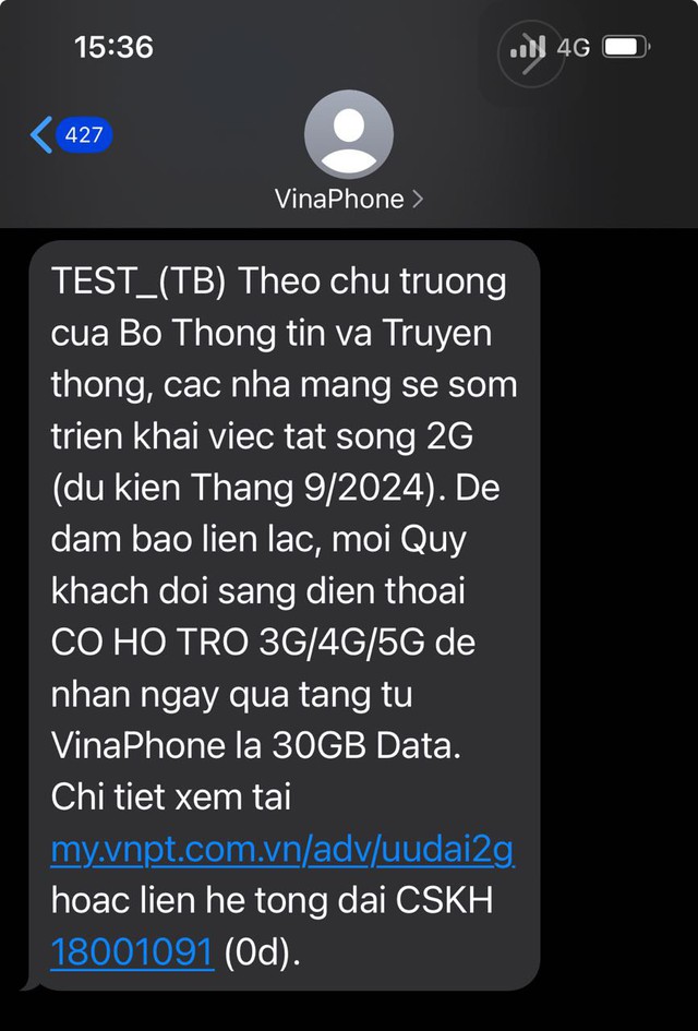 Nhằm đảm bảo dịch vụ và liên lạc thông suốt, VinaPhone khuyến cáo khách hàng kịp thời tra cứu thông tin thiết bị 2G sử dụng và chuyển đổi, nâng cấp sang các máy 3G, 4G, 5G. Trong đó, khuyến khích và hỗ trợ khách hàng tối đa khi thực hiện chuyển đổi máy điện thoại 2G, VinaPhone ưu đãi tặng ngay 30GB data (dữ liệu) tốc độ cao miễn phí (dành cho khách hàng nhận được tin nhắn ưu đãi), áp dụng từ 9-1 đến hết 15-9-2024.