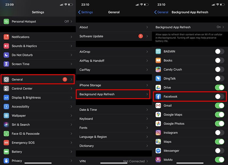 Vào Settings (Cài đặt) > General (Cài đặt chung) > Background App Refresh (Làm mới ứng dụng trong nền). Tại đây, hãy tìm ứng dụng Facebook và tắt nó đi.