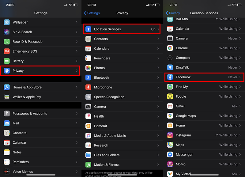 Để tắt dịch vụ định vị cho Facebook, truy cập Settings (Cài đặt) > Privacy (Quyền riêng tư) > chọn Location Services (Dịch vụ định vị). Tìm ứng dụng Facebook trong danh sách, chọn nó và ở màn hình tiếp theo, bạn chọn Never (Không).