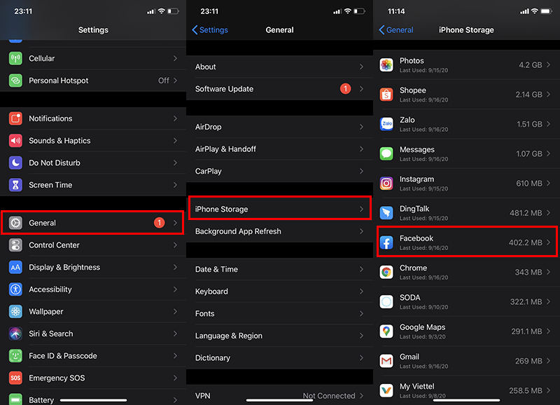 Để kiểm tra dung lượng Facebook chiếm dụng hiện tại, hãy truy cập Settings (Cài đặt) > General (Cài đặt chung) > iPhone Storage (Dung lượng iPhone) và chọn ứng dụng Facebook.