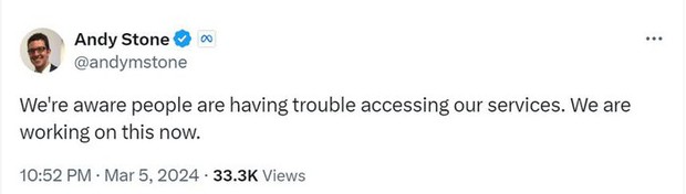 Andy Stone - Giám đốc truyền thông của tập đoàn công nghệ Meta - mới đây đã đăng tải dòng trạng thái đã xác nhận vụ việc cũng như cho biết phía Facebook đang cố gắng làm việc để khắc phục sự cố này: "Chúng tôi biết mọi người đang gặp khó khăn khi truy cập dịch vụ. Chúng tôi đang làm việc này ngay bây giờ để khắc phục".