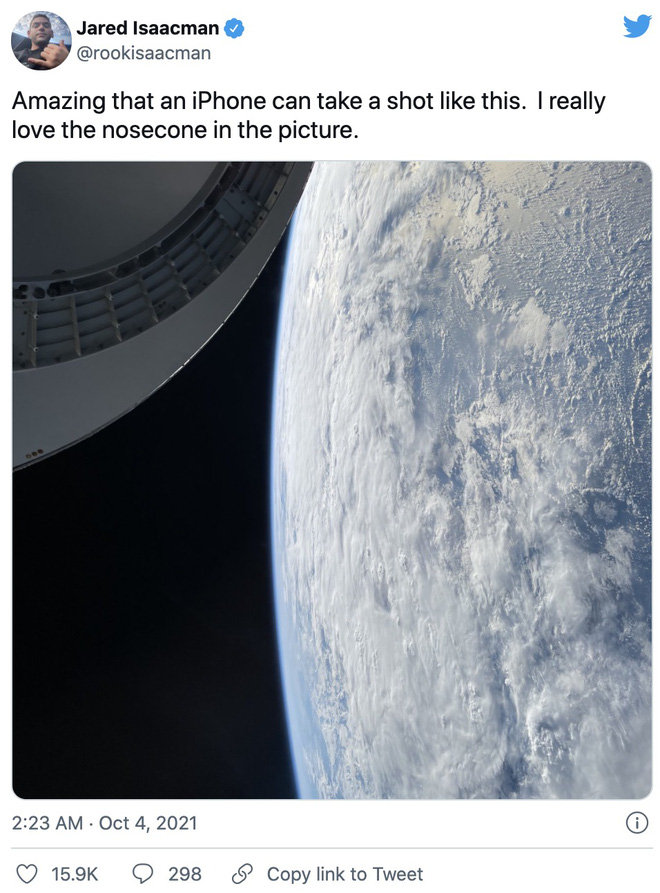 Phi hành đoàn Inspiration4 của SpaceX đã bắt đầu chia sẻ một số hình ảnh và video được chụp từ không gian trong chuyến du hành dân sự vào quỹ đạo đầu tiên trên thế giới vào tháng trước. Một vài hình ảnh đầu tiên do SpaceX chia sẻ được chụp bằng máy ảnh DSLR Nikon, nhưng những hình ảnh được chia sẻ trong gần đây nhất của chỉ huy, tỷ phú Jared Isaacman lại được chụp bằng iPhone 12.