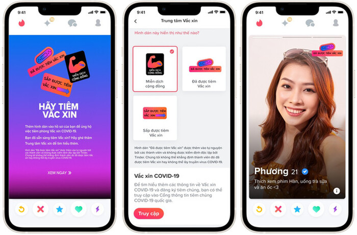 Tinder đã khởi động sáng kiến vắc-xin tại Việt Nam để khuyến khích các thành viên trẻ thuộc thế hệ Z đi tiêm chủng khi cả nước cố gắng thực hiện mục tiêu tiêm chủng cho 70% dân số trên 18 tuổi vào năm nay.