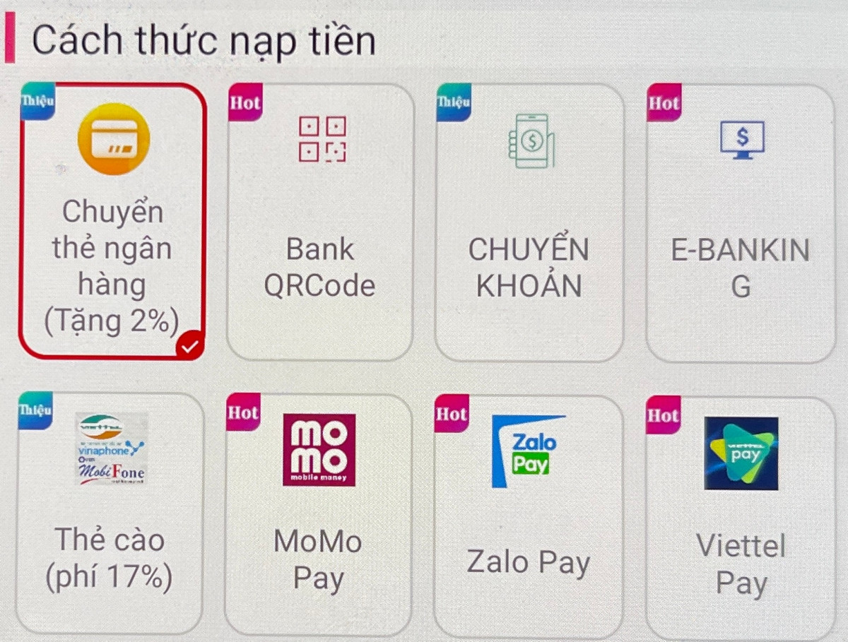 Hay khi tiến hành chuyển tiền qua MoMo, Zalo Pay hay Viettel Pay, cách thức cũng tương tự, mỗi lần nạp người chơi sẽ nhận được các tài khoản với số, tên người dùng khác nhau và nội dung chuyển tiền đều là một dãy số. Để nạp được tiền vào tài khoản, ứng dụng yêu cầu người dùng phải thực hiện đúng như điều kiện được đưa ra.