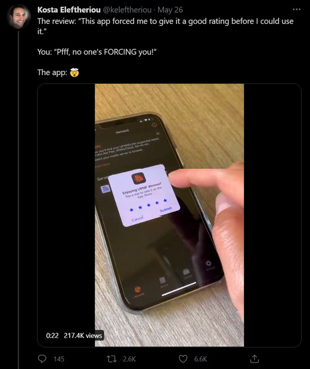 Kosta cũng đã chia sẻ một video trên tài khoản Twitter cho thấy, ứng dụng sẽ không hoạt động nếu như bạn không đánh giá tốt về ứng dụng đó.