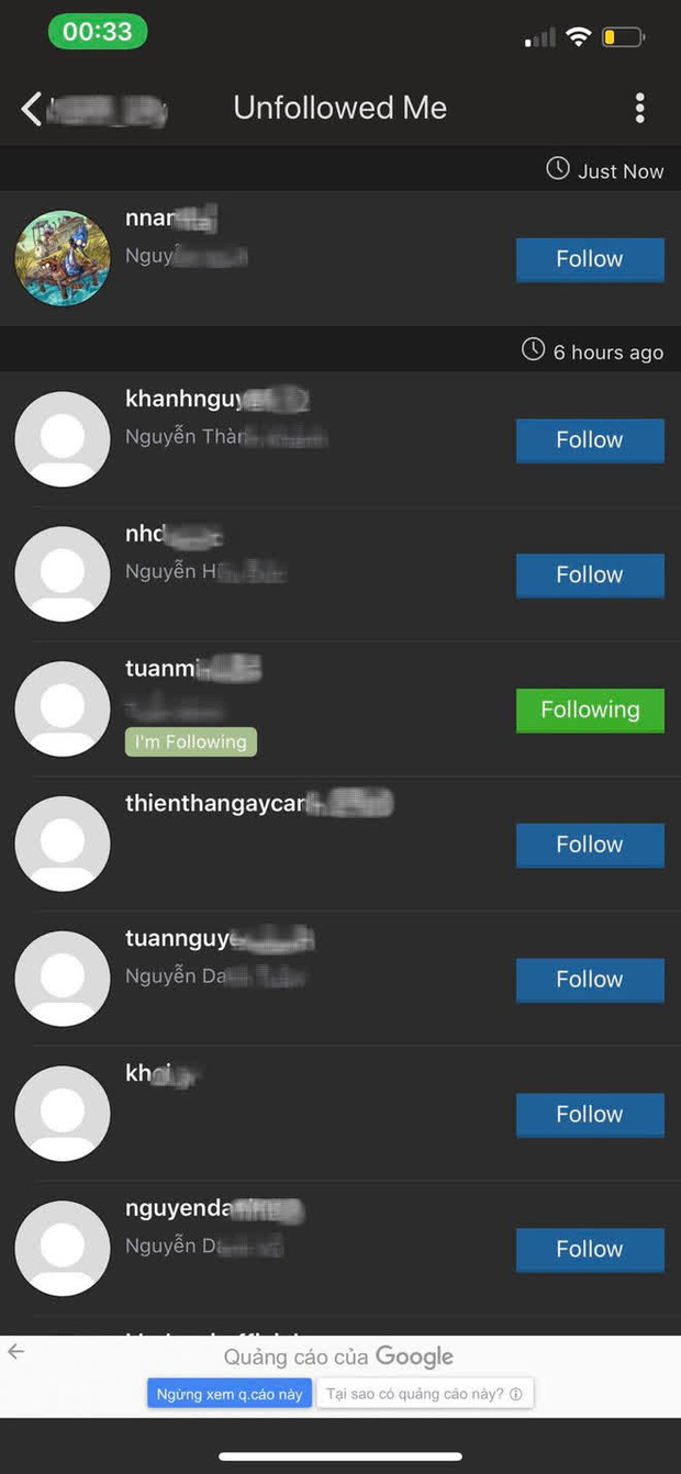 Khi bạn mở danh sách những người unfollow lên, danh sách những người đã unfollow bạn sẽ được ghi lại chi tiết thời gian, ngày unfollow. Và đặc biệt là nếu như bạn vẫn đang follow người mà unfollow bạn thì còn chần chờ gì nữa mà không "bỏ" đi.