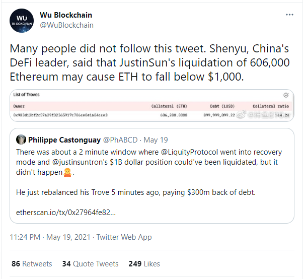 "Trong khoảng 2 phút, cửa sổ của Liquity Protocol đi vào chế độ recovery và vị thế 1 tỷ USD của Justin Sun có thể đã được thanh lý hết, nhưng điều đó đã không xảy ra. Ông Sun vừa tái cân bằng tài khoản Trove của mình 5 phút trước và trả hết khoản nợ 300 triệu USD."