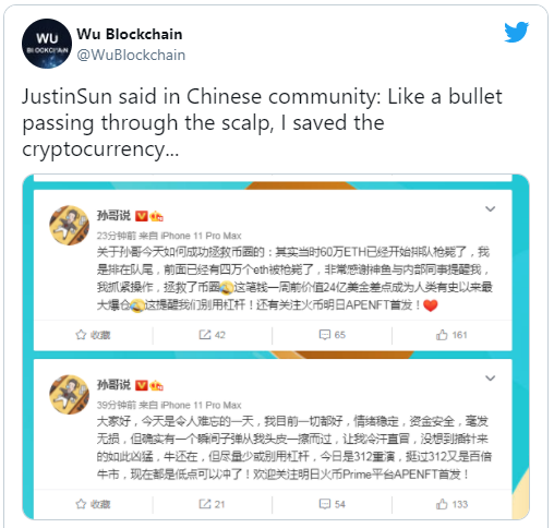 Trước đó vào ngày 19 tháng 5, Sun cho biết trên Twitter của mình rằng, tận dụng lúc giá BTC và ETH xuống thấp, anh đã mua bắt đáy một số lượng lớn bao gồm 4.145 BTC với giá trung bình 36.868 (tổng cộng khoảng 152 triệu USD) và 54.153 ETH với giá trung bình 2.509 (tổng cộng khoảng 135 triệu USD). Với mức giá trên, dường như Sun đang phải chịu lỗ, đặc biệt với ETH khi khoản lỗ lên tới hơn 17%.