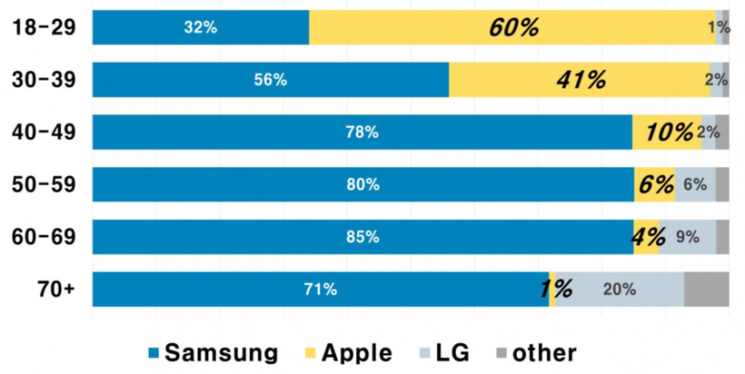 Cũng theo thống kê này, xu hướng sử dụng Samsung và những dòng điện thoại Android cao hơn ở những người trong nhóm tuổi trung niên và lão niên tại xứ sở Kim chi.