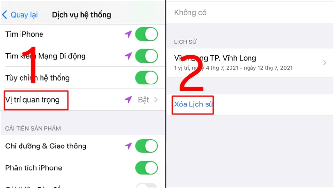 Hướng dẫn nhanh: Cài đặt > Quyền riêng tư > Dịch vụ vị trí > Dịch vụ hệ thống > Vị trí quan trọng > Xóa lịch sử.