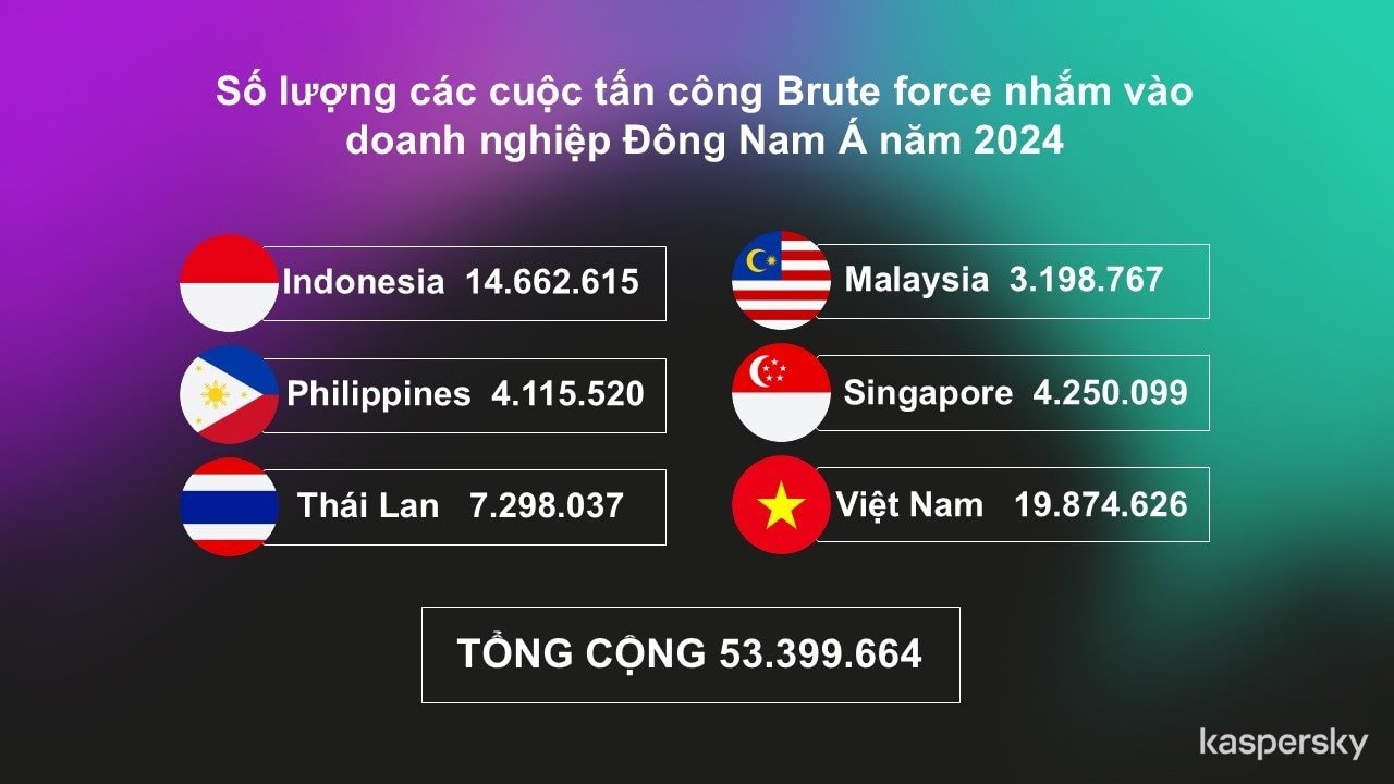 Bruteforce hay tấn công 'vét cạn' để dò mật khẩu là một trong những kỹ thuật tấn công mạng đơn giản nhưng hiệu quả đang khiến hàng triệu doanh nghiệp Đông Nam Á trở thành “mồi ngon” của tội phạm mạng. Theo thống kê mới nhất từ Kaspersky, đã có hơn 53 triệu cuộc tấn công vét cạn bị phát hiện và ngăn chặn trong khu vực năm 2024.
