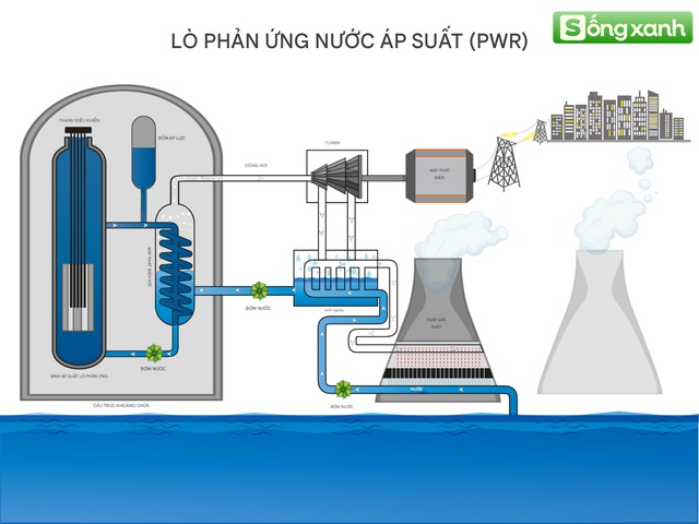 Lượng nhiệt sinh ra từ phản ứng phân hạch biến nước thành hơi nước, làm quay tua-bin để sản xuất điện sạch, không phát thải carbon.