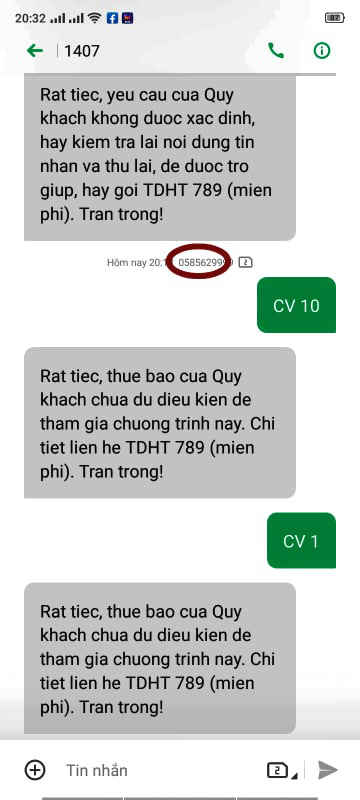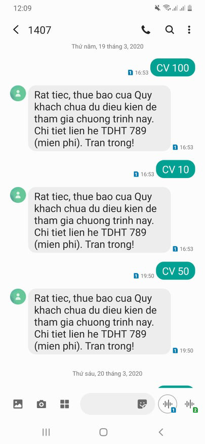 Ngay sau đó, tôi nhận được tin nhắn: "Rất tiếc, thuê bao của quý khách chưa đủ điều kiện để tham gia chương trình này. Chi tiết liên hệ TDHT 789…".