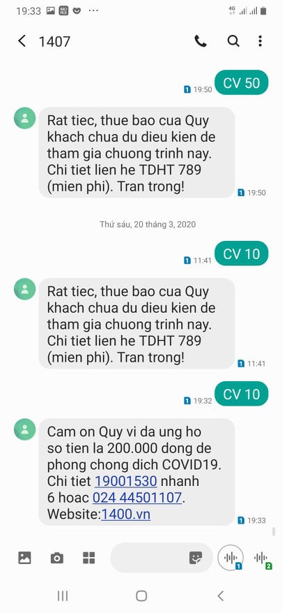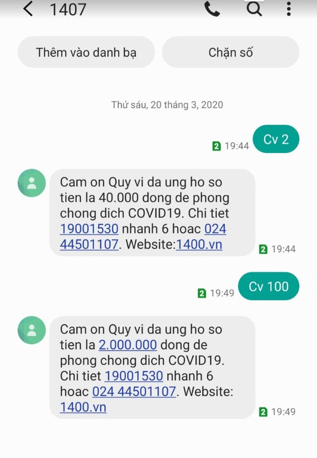 Anh Nguyễn Tiến Đ. (chủ thuê bao 058xxx9999) cho biết: "Nhằm hưởng ứng lời kêu gọi của Chính phủ hỗ trợ đồng bào cả nước, góp phần hạn chế những nguy cơ ảnh hưởng trực tiếp của dịch bệnh COVID-19 đến tính mạng, sức khoẻ, đời sống của người dân, thiệt hại kinh tế cũng như trật tự, an toàn xã hội, tôi đã nhắn tin theo cú pháp hướng dẫn là CV n gửi về 1407.