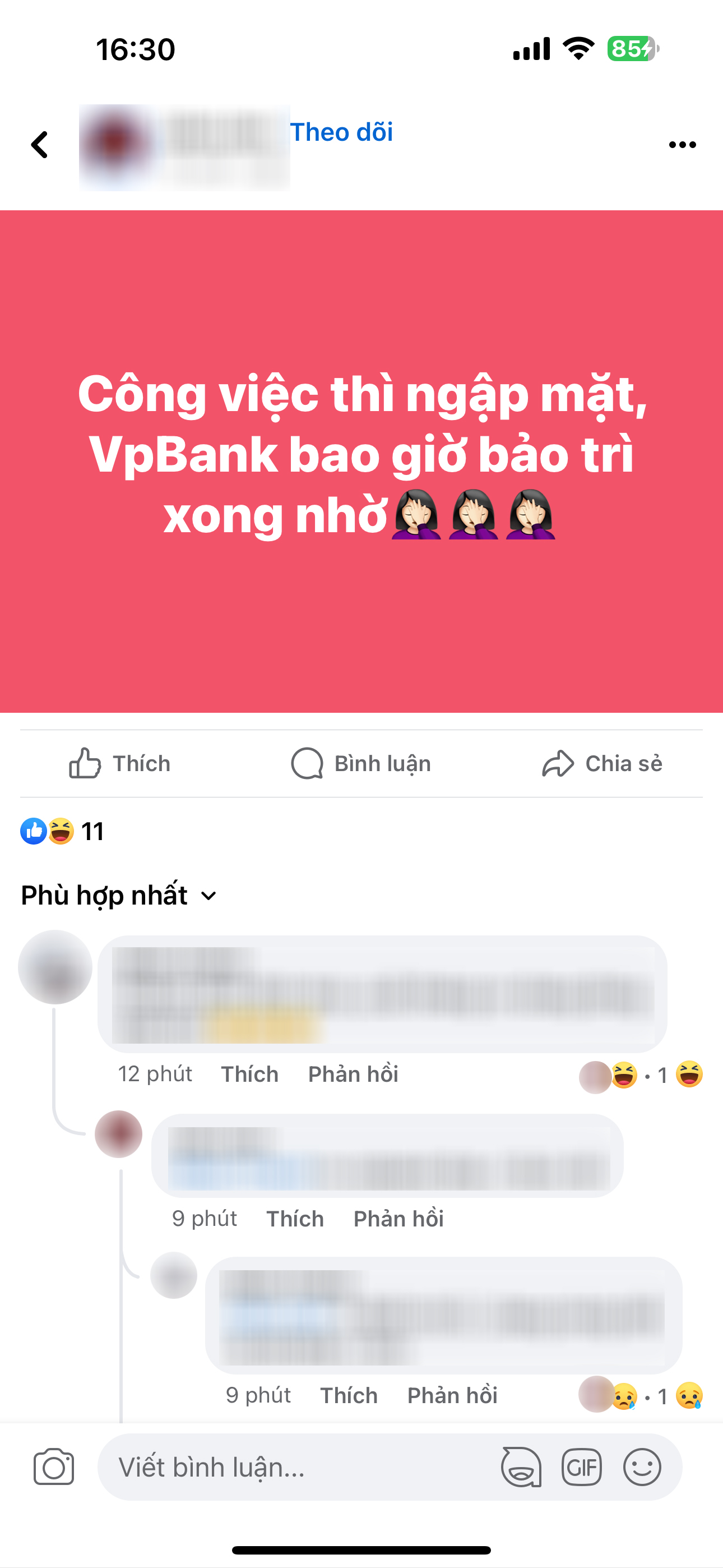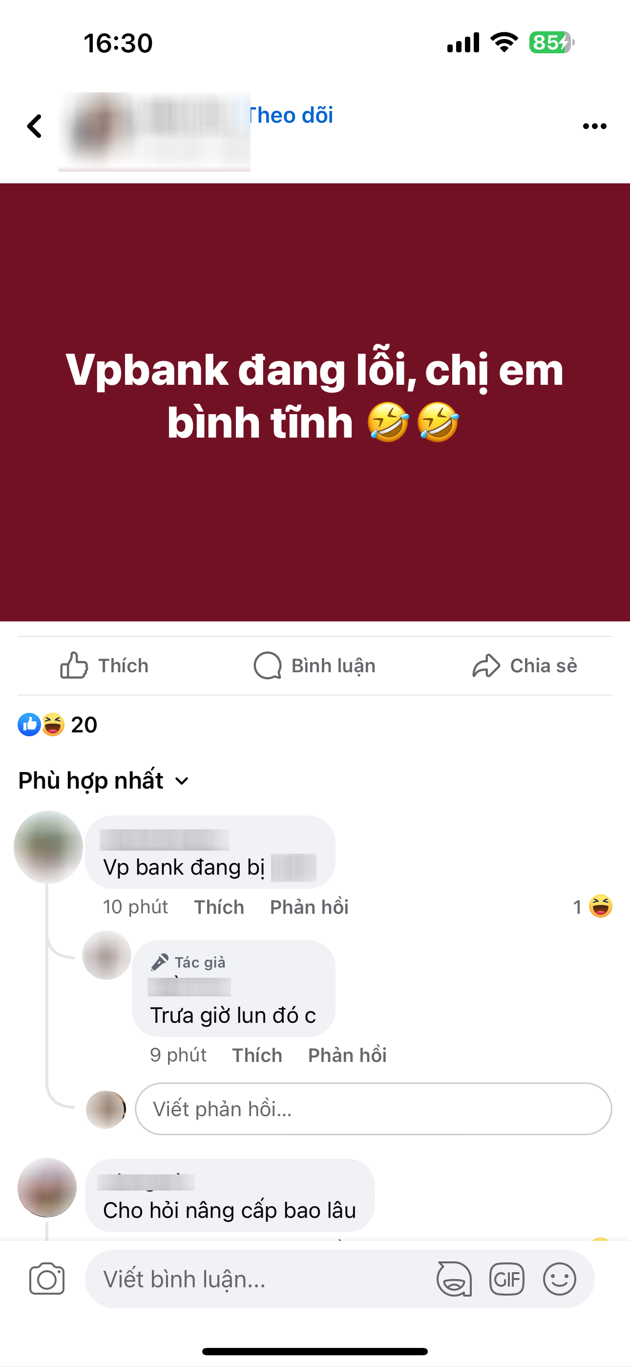 Đặc biệt, VPBank không hề báo trước việc thực hiện nâng cấp này và đã làm từ tận giờ trưa cho đến hiện tại là đã gần qua giờ hành chính. Trên mạng xã hội, không ít bài đăng than thở vì lương đã về nhưng chưa thể rút ra sử dụng được từ các nhân viên mà công ty thực hiện chuyển lương qua ngân hàng VPBank.