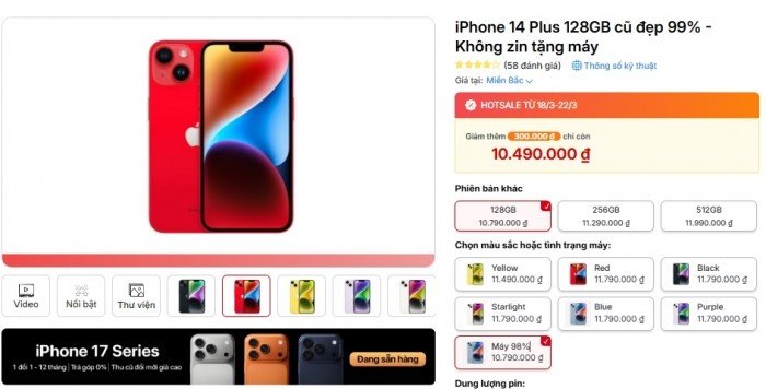 18/03/2026 15:13Vua pin trâu giá rẻ gọi tên iPhone 14 Plus, loanh quanh 10 triệu, rẻ hơn iPhone 17e
