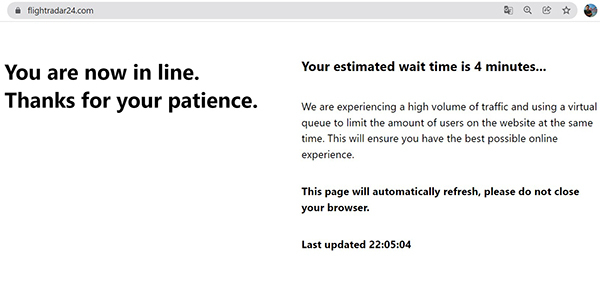 Khi truy cập Flightradar24, người dùng phải xếp hàng để có thể sử dụng website. Một thông báo được đưa ra từ Flightradar24 cho biết trang web phải xử lý một lượng lớn truy cập đồng thời.
