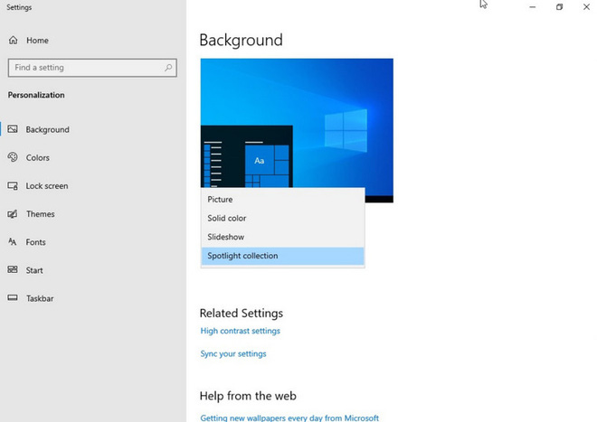 Bạn có thể bật tính năng Desktop Spotlight bằng cách đi tới Cài đặt (Settings)> Cá nhân hóa (Personalization)> Hình nền (Background) và chọn Bộ sưu tập Spotlight (Spotlight Collection) trong menu Background xổ xuống. Sau khi bật tính năng này, máy tính sẽ tự tạo một slideshow sử dụng ảnh đẹp từ Bing trên desktop.