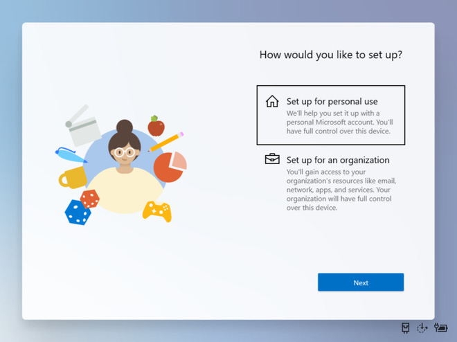 Sự đơn giản bắt đầu ngay từ khi thiết lập những cài đặt đầu tiên. Tuy nhiên Windows 10X sẽ yêu cầu người dùng phải có tài khoản Microsoft để bắt đầu. Sẽ có hai lựa chọn là máy tính cá nhân hoặc máy tính của tổ chức, doanh nghiệp.
