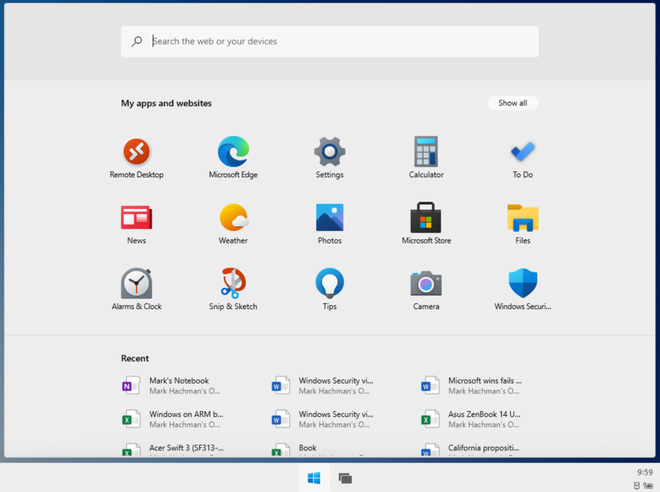 Không có menu Start quen thuộc ở góc dưới bên trái. Không có các ô Live Tile sinh động đầy màu sắc. Menu Start giờ đây chỉ là một biểu tượng đơn sắc phía dưới cùng, khi nhấp vào sẽ trượt lên và hiện ra một “ngăn kéo ứng dụng” khá giống với Chromebook.