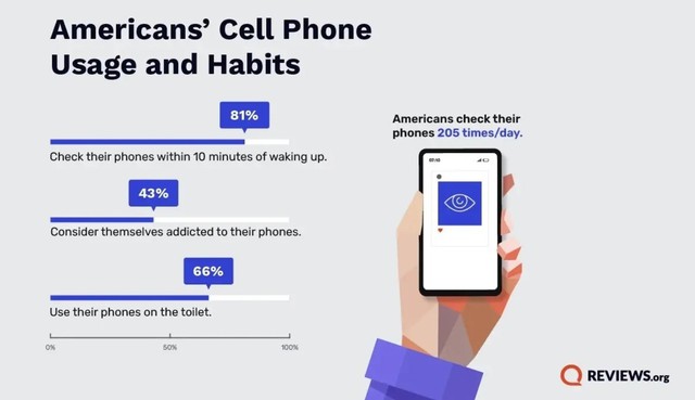 Theo một cuộc khảo sát do Reviews.org thực hiện, người Mỹ trung bình kiểm tra điện thoại thông minh đến 205 lần mỗi ngày.
