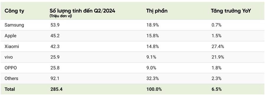 Xếp thứ ba là Xiaomi của Trung Quốc, chiếm 14,8% thị trường điện thoại thông minh toàn cầu. Trong thập kỷ qua, thị phần toàn cầu của công ty đã tăng gấp ba lần. Tiếp theo là hai gã khổng lồ điện thoại thông minh khác của Trung Quốc là vivo và OPPO, mỗi công ty bán được hơn 25 triệu chiếc trong quý 2 năm 2024.