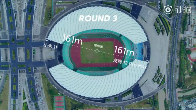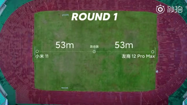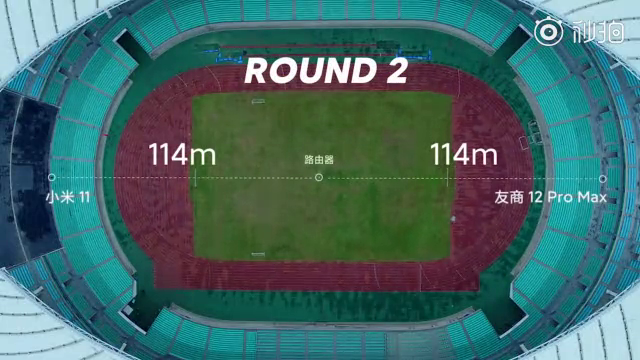 Router AX6000 được đặt chính giữa sân, và Mi 11 và iPhone 12 Pro Max sẽ trải qua ba bài thử nghiệm ở ba vị trí khác nhau là cầu môn (cách router 53m), khán đài gần (cách router 114m) và khán đài xa (cách 161m). Kết quả là cả trong ba bài thử nghiệm, Mi 11 đều cho tốc độ tải về gấp ~2 lần so với iPhone 12 Pro Max.