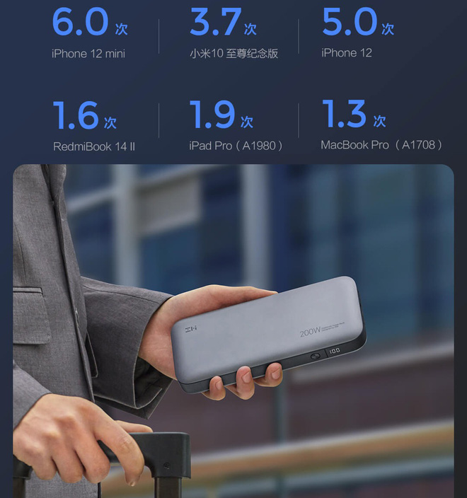 Với viên pin 25.000mAh, ZMI No.20 Power Bank Pro 200W có thể sạc đầy 6 lần cho iPhone 12 mini, 3.7 lần cho Mi 10 Ultra, 5 lần cho iPhone 12, 1.6 lần cho RedmiBook 14 II, 1.9 lần cho iPad Pro và 1.3 lần cho MacBook Pro (A1708).