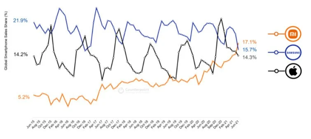 Đây không phải điều bất ngờ khi Xiaomi tăng trưởng ổn định suốt 18 tháng qua. Danh mục sản phẩm năm 2021 của hãng khá mạnh với Redmi Note 10 Pro và Mi 11 Ultra.Theo báo cáo tháng 6 của hãng nghiên cứu Counterpoint, Xiaomi lại lập thành tích mới khi đánh bại Samsung để đứng đầu thị trường smartphone toàn cầu. Theo Counterpoint, doanh số tháng 6 của Xiaomi tăng 26%, cao hơn doanh số của Samsung. Như vậy, hiện nay thị phần Xiaomi là 17,1% còn Samsung là 15,7%.