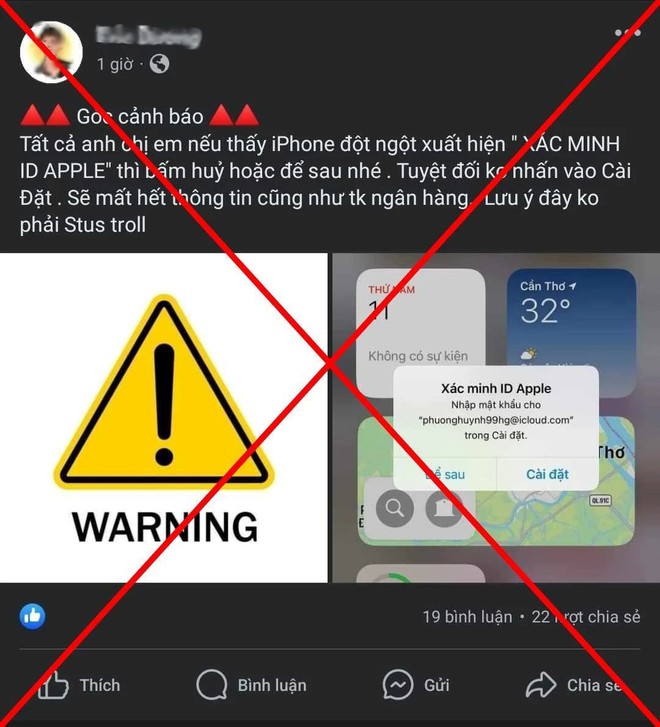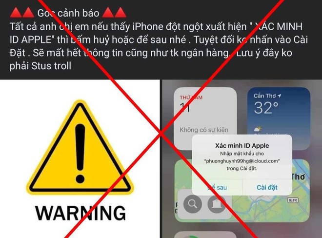Sau hiện tượng trên, MXH cũng xuất hiện nhiều cảnh báo đây là chiêu trò tấn công nhằm đánh cắp tài khoản ngân hàng, thông tin người dùng... với nội dung: "Nếu thấy iPhone đột ngột xuất hiện Xác minh Apple ID mà những tài khoản hiện lên đều rất lạ, hãy bấm hủy hoặc để sau. Tuyệt đối không nhấn vào Cài đặt, sẽ mất hết thông tin cũng như tài khoản ngân hàng". Cảnh báo này được lan truyền và chia sẻ với tốc độ chóng mặt. Điều này càng khiến cư dân mạng, đặc biệt là những người sử dụng thiết bị iOS của Apple hoang mang.
