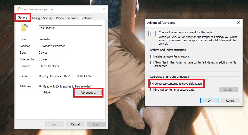 Ở mục General, bạn chọn mục Advanced. Một cửa sổ mới hiện lên, bạn bỏ chọn ô Compress contents to save disk space đi là được. Tuy nhiên, các bạn cũng cần phải lưu ý là nếu bỏ tính năng này đi, các file và thư mục sẽ không còn được nén nữa và chúng sẽ chiếm kha khá dung lượng của ổ đĩa đấy, nên nếu bạn không có vấn đề gì thì tốt nhất cứ để yên đó.