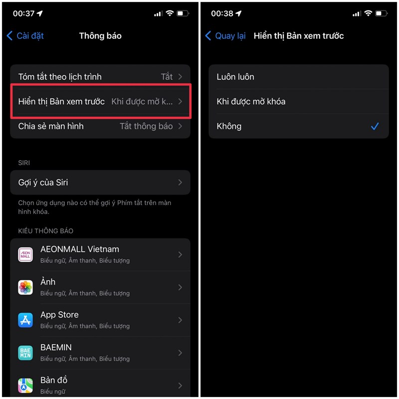 Bước 2 : Tiếp theo, bạn nhấn vào “ Hiển thị bản xem trước ”. Tại đây, bạn chọn “ Khi được mở khóa ” hoặc “ Không ” để hoàn tất quá trình ẩn tin nhắn của toàn bộ các ứng dụng trên màn hình điện thoại.