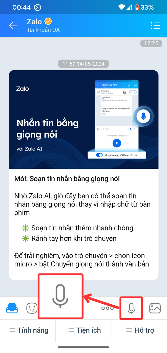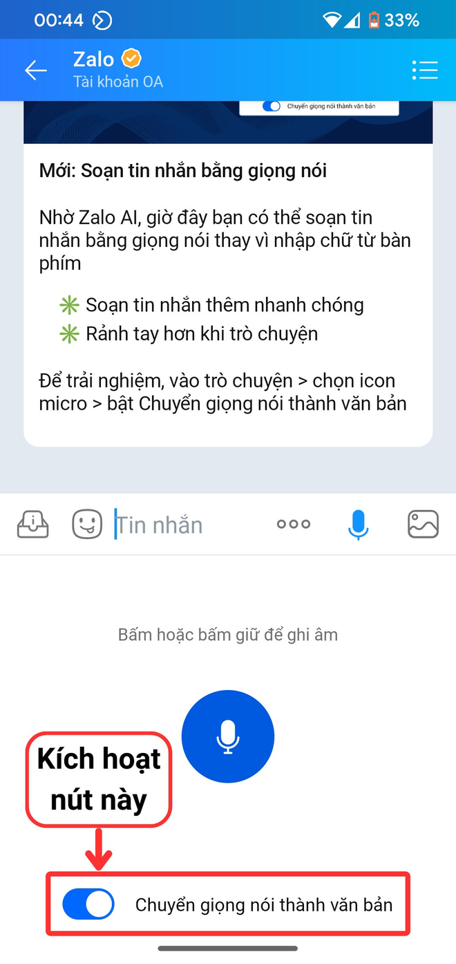 Bước 5: Nhấn hoặc giữ biểu tượng microphone và nói nội dung tin nhắn muốn gửi đi. Zalo AI sẽ tự động chuyển giọng nói của bạn vào khung nhập liệu dưới dạng nội dung văn bản.