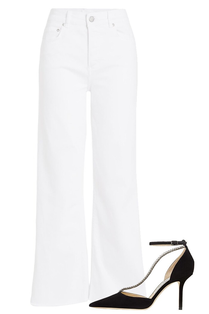 Màu trắng của quần và màu đen của giày sẽ không tương phản quá mạnh nếu bạn kết hợp thêm một item nữa màu đen, ví dụ như áo tank top, ví cầm tay, kính râm.